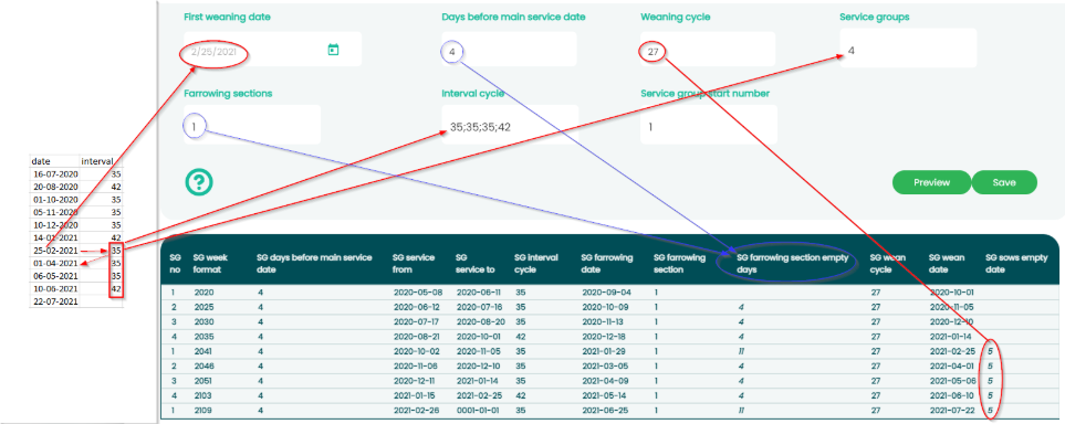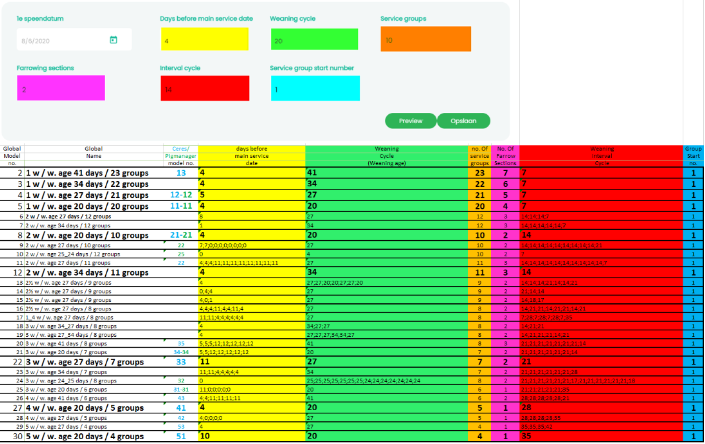 Note that it is possible to add a model with alternating “days before main service date”, by adding the sequence separated with semicolon, like in “Interval cycle” and “SG sows empty days”.